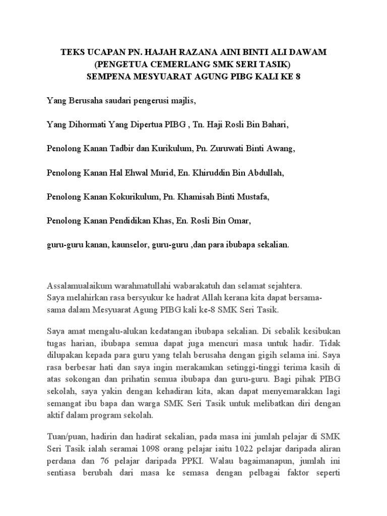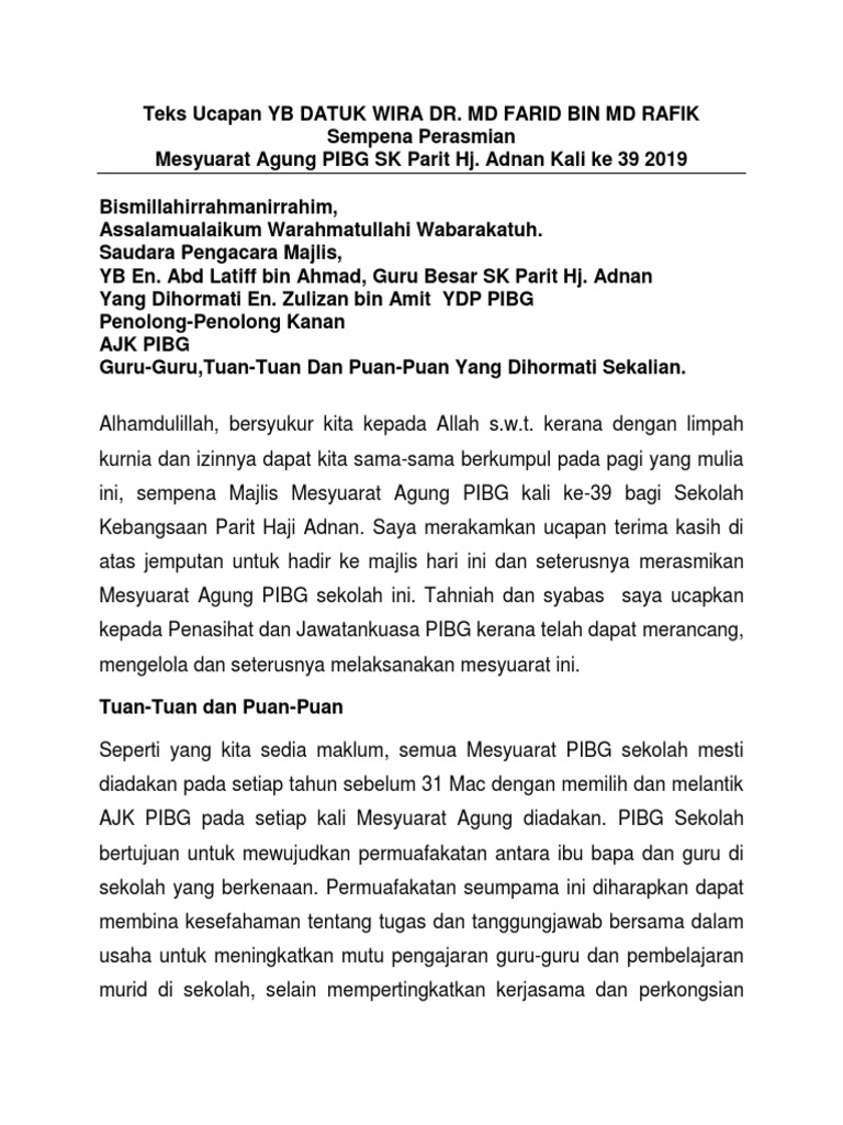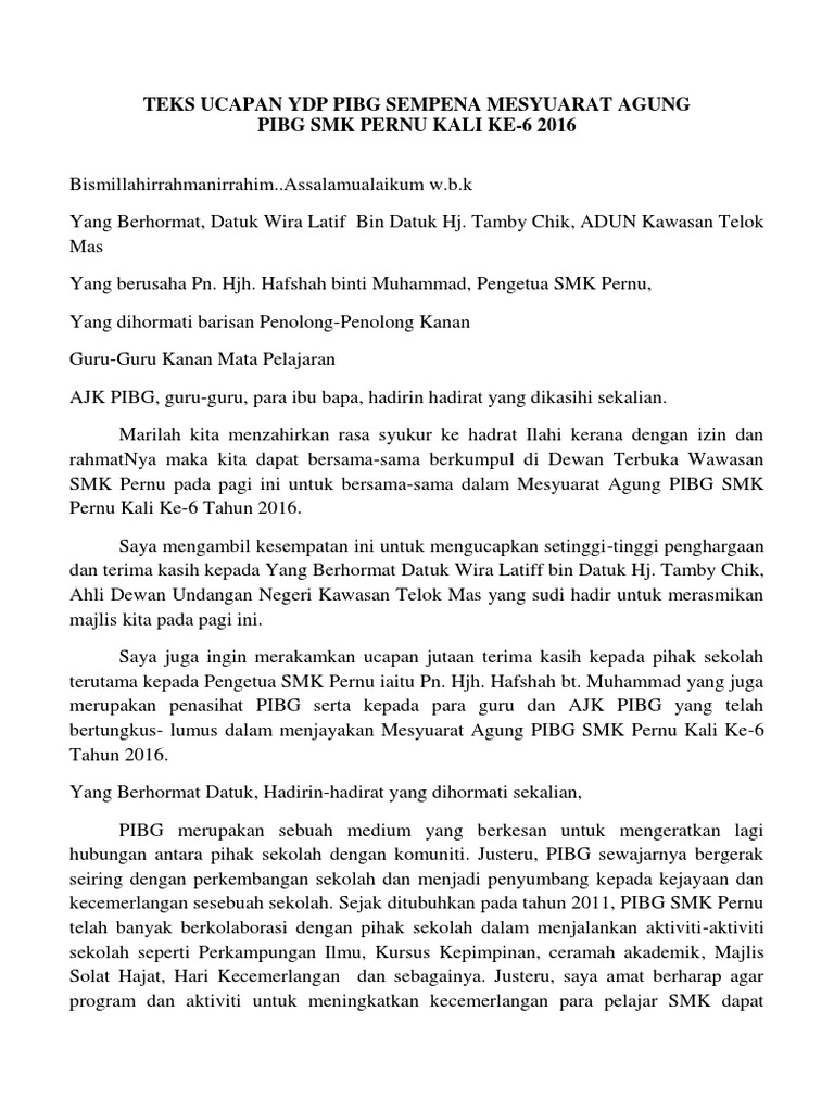 Teks Ucapan Ydp Pibg Sempena Mesyuarat Agung Pibg Smk Pernu Kali Ke Pdf